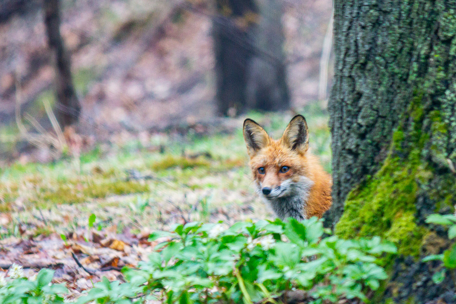 The woods behind our house at the time was home to several beautiful foxes. One day I saw this cutie walk by the front door and I followed it outside with my camera. Thinking it ran away, I nearly went back inside when I saw the fox pokes its head out from behind a tree. I only managed to get this picture before it got scared and ran back home into the woods.